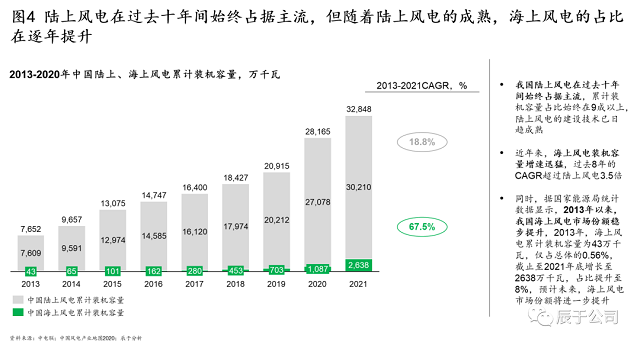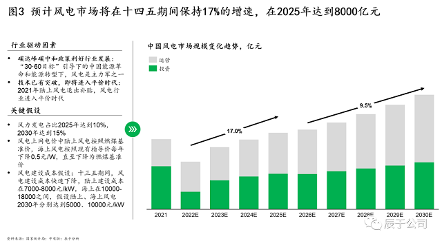 在政策和技術兩大因素的驅動下,辰于預測我國風電市場整體將在十四五期間保持17%的增速,在2025年達到8000億元,在2030年突破12000億元(包括投資和運營,見圖3),市場規(guī)模達到萬億只是未來10年間的事情。