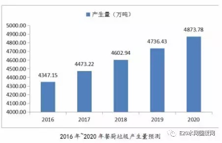 E20研究院的《餐廚垃圾處理市場分析報(bào)告(2016)》指出,近年來我國經(jīng)濟(jì)快速發(fā)展,餐廚垃圾以每年10%的增量不斷增長。按照城鎮(zhèn)人口每人每天產(chǎn)生0.15kg餐廚垃圾計(jì)算,我國2011年的餐廚垃圾產(chǎn)生量為3782萬噸,到2015年我國的餐廚垃圾產(chǎn)生量增長到了4222萬噸。我國餐廚垃圾處理行業(yè)也在2015年迎來了市場的集中爆發(fā)期。預(yù)計(jì)2016年我國餐廚垃圾的產(chǎn)生量為4347萬噸,到“十三五”末期,我國的餐廚垃圾產(chǎn)生量將增長至4873萬噸,餐廚垃圾處理形勢嚴(yán)峻。