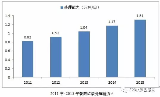 餐廚垃圾處理市場有很大的發(fā)展空間。根據(jù)《“十三五”全國城鎮(zhèn)生活垃圾無害化處理設(shè)施建設(shè)規(guī)劃(征求意見稿)》,“十三五”末期,我國餐廚垃圾日處理能力應(yīng)達(dá)到4萬噸/天,處理率達(dá)30%左右。而據(jù)E20研究院預(yù)測,到2020年,我國的餐廚垃圾處理能力可達(dá)4.52萬噸/天。