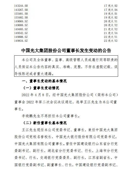 據(jù)中國光大集團(tuán)股份公司官網(wǎng)消息,4月8日,集團(tuán)召開董事會2022年第二次會議決議通過,選舉王江先生為本公司董事長。根據(jù)公告,王江現(xiàn)任本公司黨委書記、董事長,兼任中國光大集團(tuán)股份公司黨校名譽(yù)校長,中國光大銀行股份有限公司黨委書記,中國光大集團(tuán)有限公司董事長。