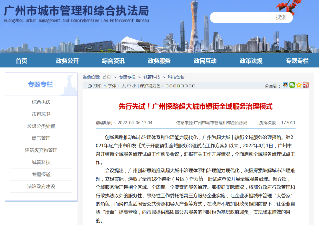 創(chuàng)新思路推動(dòng)城市治理體系和治理能力現(xiàn)代化,廣州為超大城市鎮(zhèn)街全域服務(wù)治理探路。鳳凰網(wǎng)廣東自市城市管理綜合執(zhí)法局獲悉,繼2021年底廣州市印發(fā)《關(guān)于開(kāi)展鎮(zhèn)街全域服務(wù)治理試點(diǎn)工作方案》以來(lái),2022年4月1日,廣州市召開(kāi)鎮(zhèn)街全域服務(wù)治理試點(diǎn)工作動(dòng)員會(huì)議,匯報(bào)有關(guān)工作開(kāi)展情況,全面啟動(dòng)全域服務(wù)治理試點(diǎn)工作。
