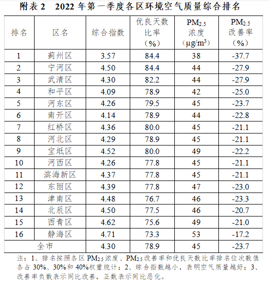 2022年3月及第一季度天津市各區(qū)環(huán)境空氣質(zhì)量狀況發(fā)布