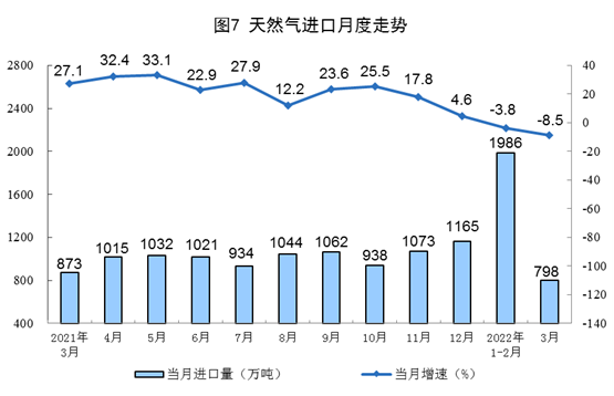 天然氣生產(chǎn)保持增長,進(jìn)口降幅擴(kuò)大。3月份,生產(chǎn)天然氣197億立方米,同比增長6.3%,增速比1—2月份放緩0.4個百分點(diǎn),日均產(chǎn)量6.3億立方米。進(jìn)口天然氣798萬噸,同比下降8.5%,降幅比1—2月份擴(kuò)大4.7個百分點(diǎn)。