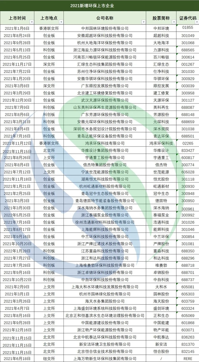 2021新增環(huán)保上市公司