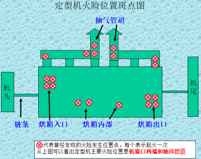 由下圖可知,定型機著火點主要集中在烘箱的進(jìn)出口和管道內(nèi)部,風(fēng)機拉風(fēng),火借風(fēng)勢,使得火勢蔓延起來非??欤葹?zāi)稍有延誤對印染企業(yè)就會造成不可挽回的損失。因此,如何將發(fā)現(xiàn)火情、熄滅火勢的時間壓縮到極致,是三鑫自動化重點突破的課題。
