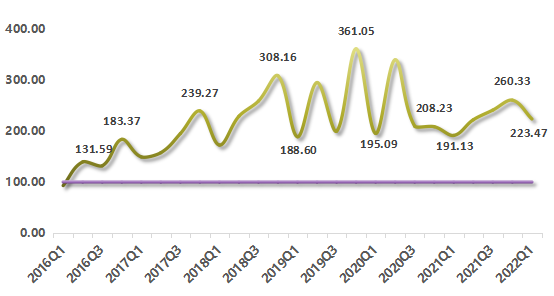 浙江省排污權(quán)交易活躍度呈上下波動(dòng)走勢。2022年第一季度,浙江省排污權(quán)交易活躍度指數(shù)為223.47點(diǎn),環(huán)比下行14.16%,同比上行16.92%。