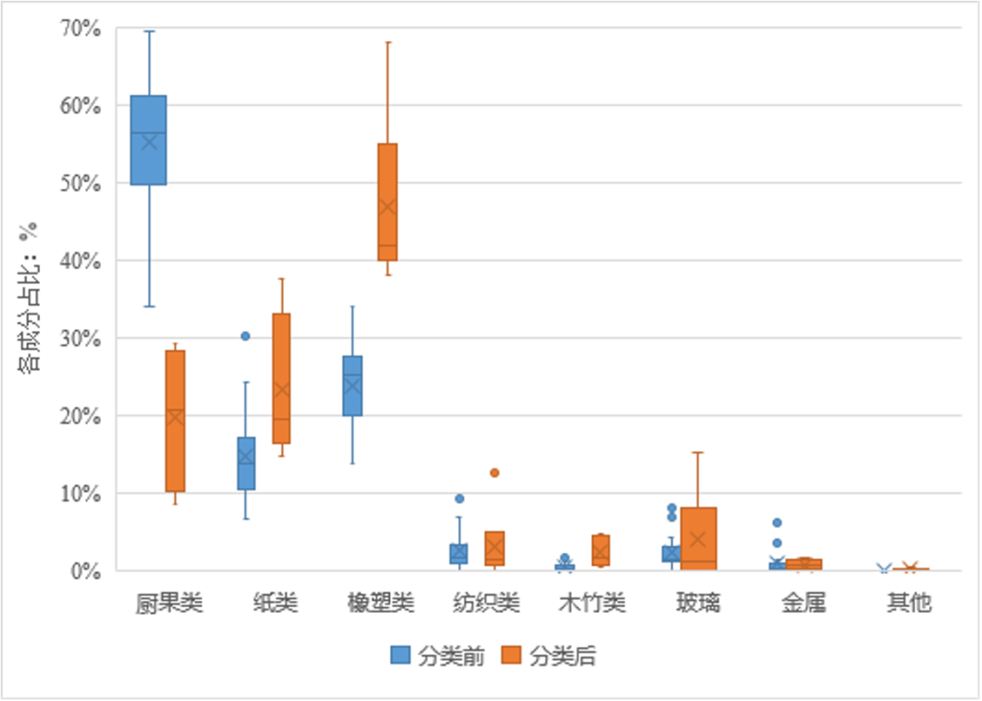 分類前,進(jìn)入焚燒廠的垃圾成分中廚果類占比55.24%,橡塑類占比23.82%,紙類占比14.71%,紡織類、玻璃類、金屬類、木竹類、磚瓦陶瓷類等合計占比6.23%。垃圾分類后,進(jìn)入焚燒廠的生活垃圾廚果類占比19.63%,橡塑類占比46.81%,紙類占比23.24%,紡織類、玻璃類、金屬類、木竹類、磚瓦陶瓷類等合計占比10.32%。