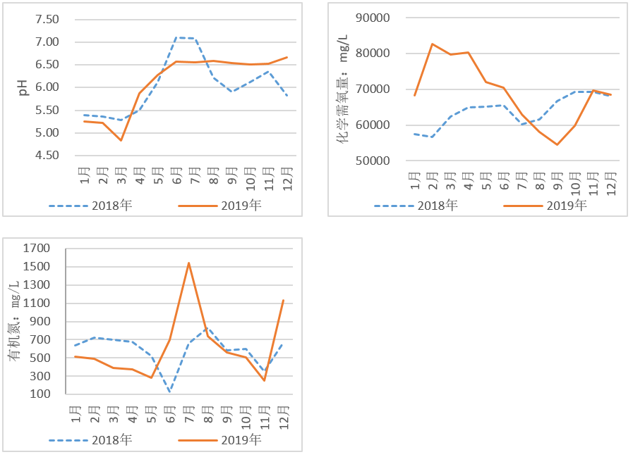圖12 2018年與2019年生活垃圾分類前后滲濾液水質(zhì)中pH、化學(xué)需氧量、總氮變化趨勢