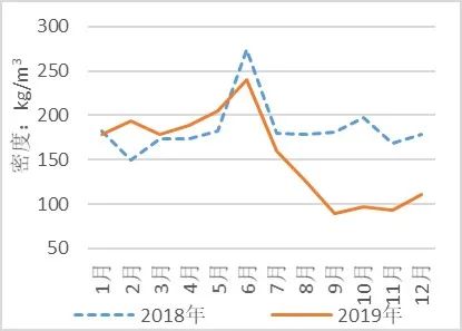 生活垃圾中的廚果類與橡塑類密度相近,與之相比紙類密度較低;垃圾分類導(dǎo)致廚果類與橡塑類合計占比下降12.62%,紙類占比上升8.53%,進(jìn)而影響垃圾密度降低。垃圾密度在2019年1-6月(分類前)與2018年同期(分類前)相比上升4%,7-12月(分類后)同期相比下降38%,由此推算分類后的垃圾密度與分類前同期相比下降42%,見圖8。