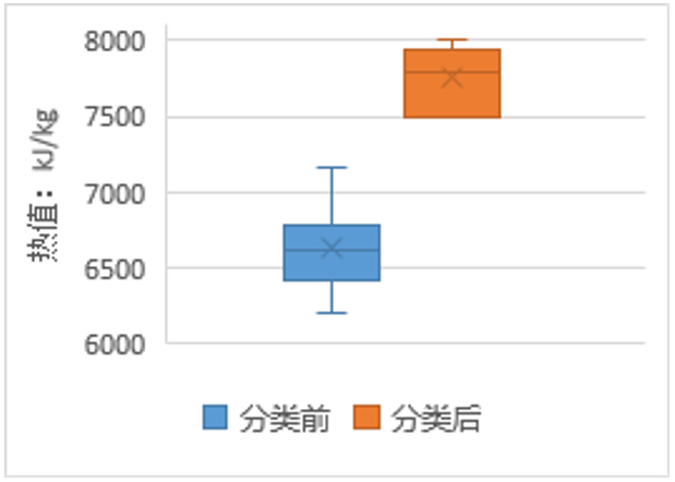 生活垃圾分類前后熱值分布對比見圖4。分類前,進(jìn)入焚燒廠垃圾熱值為6208-7165 kJ/kg,均值為6634 kJ/kg。分類后,進(jìn)入焚燒廠垃圾熱值為7490-7997 kJ/kg,均值為7749 kJ/kg。