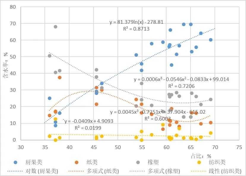 垃圾組分中,廚果類、紙類、橡塑類及紡織類垃圾對含水率影響較大[6]。選取2018年1月-2019年12月生活垃圾各組分占比變化與含水率數(shù)據(jù)耦合分析,廚果類占比與含水率呈正相關(guān)關(guān)系;橡塑類、紡織類占比與含水率呈負(fù)相關(guān)關(guān)系;而紙類占比與垃圾水率關(guān)系呈波動關(guān)系,即為在占比低于45%及高于65%時與含水率成正相關(guān)關(guān)系,占比在45%-65%與含水率成負(fù)相關(guān)關(guān)系,垃圾主要成分對垃圾含水率影響趨勢見圖14。