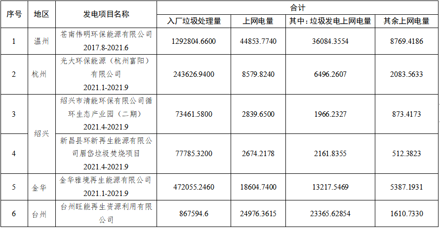 二、補(bǔ)充核定光大環(huán)保能源(杭州富陽(yáng))有限公司2021年1-9月、金華雅境再生能源有限公司2021年1-9月、紹興市清能環(huán)保有限公司循環(huán)生態(tài)產(chǎn)業(yè)園(二期)2021年4-9月、新昌縣環(huán)新再生能源有限公司眉岱垃圾焚燒項(xiàng)目2021年4-9月、臺(tái)州旺能再生資源利用有限公司2017年4月-2018年9月及2020年4-6月的垃圾發(fā)電上網(wǎng)電量。重新核定蒼南偉明環(huán)保能源有限公司2017年8月至2021年6月垃圾發(fā)電上網(wǎng)電量。具體詳見附件2。