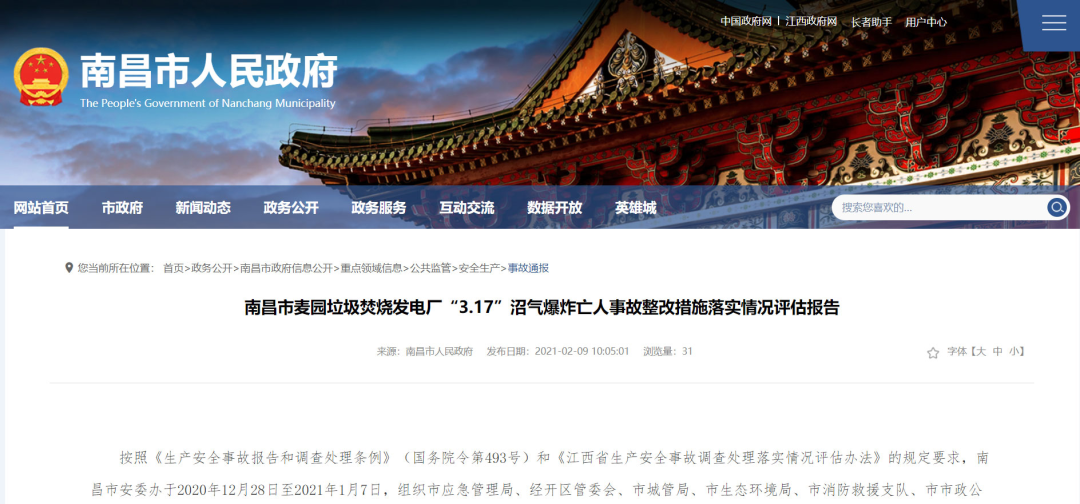 2020年3月17日下午15時(shí)38分,江西省南昌市經(jīng)濟(jì)技術(shù)開發(fā)區(qū)麥園生活垃圾焚燒發(fā)電建設(shè)項(xiàng)目的滲濾液處理站發(fā)生一起沼氣爆炸事故,導(dǎo)致現(xiàn)場(chǎng)作業(yè)人員1人死亡,3人受傷。