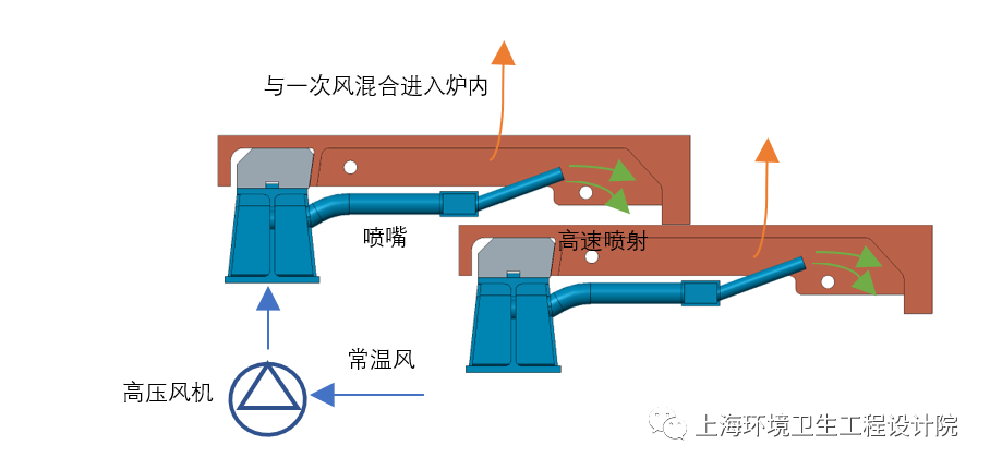 強(qiáng)制風(fēng)冷依靠風(fēng)管引入常溫高壓冷卻空氣,通過噴管高速吹掃爐排片高溫區(qū)域,局部溫度平均降低30℃~50℃,從而避免爐排片局部高溫?zé)龘p。上海環(huán)境院的風(fēng)冷爐排系統(tǒng)如圖5所示,常溫空氣經(jīng)過高壓風(fēng)機(jī)吹掃爐排片后與一次風(fēng)混合進(jìn)入焚燒爐參與燃燒,該設(shè)計(jì)不僅結(jié)構(gòu)簡單,而且便于控制調(diào)節(jié),靈活可靠。