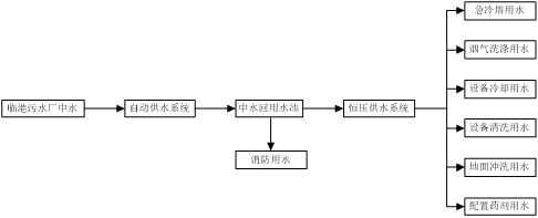 因臨港污水廠的毗鄰企業(yè)——上海天漢環(huán)境資源有限公司地處供水網絡末端且其日常工業(yè)用水體量大,故經雙方協商,臨港污水廠設置專用的中水泵房及輸送管線,將消毒后的最終出水作為中水供應給天漢環(huán)境,并通過在線儀表實時監(jiān)控中水中的COD、氨氮、總磷、總氮、pH值等水質指標,保障中水水質的穩(wěn)定達標;天漢環(huán)境對中水進行進一步的處理并用于消防、冷卻塔、煙氣洗滌、設備冷卻、設備清洗、地面沖洗和藥劑配置等用途。