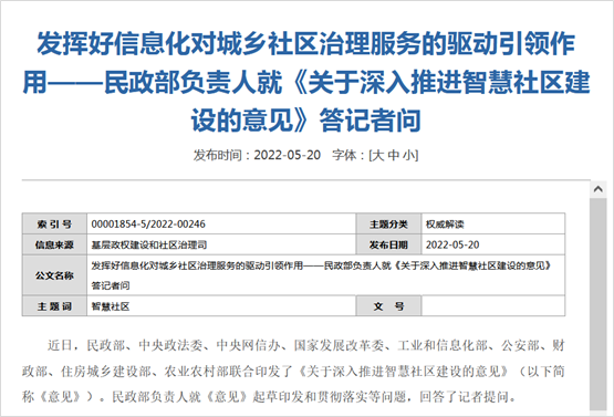 在深入學(xué)習(xí)領(lǐng)會(huì)習(xí)近平總書記關(guān)于網(wǎng)絡(luò)強(qiáng)國重要論述和中央決策部署精神,認(rèn)真總結(jié)梳理近年來各地探索推進(jìn)智慧社區(qū)建設(shè)行之有效經(jīng)驗(yàn)做法的基礎(chǔ)上,民政部、中央政法委、中央網(wǎng)信辦、國家發(fā)展改革委、工業(yè)和信息化部、公安部、財(cái)政部、住房城鄉(xiāng)建設(shè)部、農(nóng)業(yè)農(nóng)村部等部門印發(fā)的《意見》,對(duì)于指導(dǎo)各地深化物聯(lián)網(wǎng)、大數(shù)據(jù)、云計(jì)算和人工智能等信息技術(shù)應(yīng)用,集約建設(shè)便民惠民智慧服務(wù)圈,提升城鄉(xiāng)社區(qū)治理服務(wù)智慧化、智能化水平,讓社區(qū)更加和諧有序、服務(wù)更有溫度,不斷增強(qiáng)居民獲得感、幸福感、安全感,具有十分重要的指導(dǎo)意義。