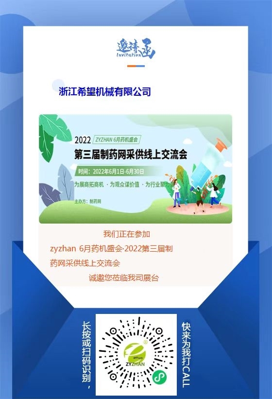 由制藥網(wǎng)主辦的zyzhan 6月藥機(jī)盛會(huì)——2022第三屆制藥網(wǎng)采供線(xiàn)上交流會(huì)(在線(xiàn)展會(huì))(簡(jiǎn)稱(chēng)“zyzhan 6月藥機(jī)盛會(huì)”)即將于2022年6月1日-6月30日舉行。本次盛會(huì)設(shè)原料藥機(jī)械館、制劑機(jī)械館、儀器儀表館、藥品包裝機(jī)館、制藥用水/氣設(shè)備館、通用機(jī)械設(shè)備館、其他制藥設(shè)備館,目前超百家企業(yè)都已入駐相應(yīng)展館,正在等待與您相見(jiàn)!