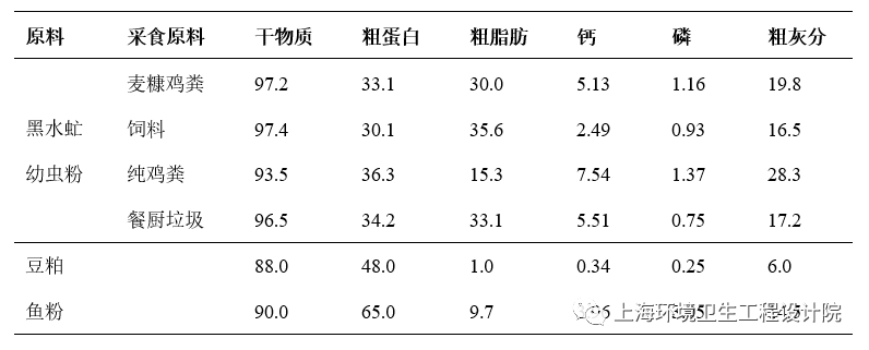 研究表明,黑水虻幼蟲的營(yíng)養(yǎng)價(jià)值較高,營(yíng)養(yǎng)組成具有一定的可塑性。分析表1數(shù)據(jù)可知,其體內(nèi)特定營(yíng)養(yǎng)組分的含量高低可通過(guò)調(diào)節(jié)其采食的有機(jī)廢棄物的營(yíng)養(yǎng)來(lái)實(shí)現(xiàn)。黑水虻烘干蟲粉中粗脂肪、鈣和灰分的含量受到采食底物的影響較大,而蛋白質(zhì)和氨基酸組成則相對(duì)比較穩(wěn)定。雖然幼蟲的氨基酸總含量低于黃粉蟲、蠅蛆、桑蠶蛹的氨基酸含量,但氨基酸如賴氨酸、蛋氨酸、亮氨酸、纈氨酸和酪氨酸含量較高,可通過(guò)優(yōu)化飼料配方增加飼料氨基酸含量,并不影響作為動(dòng)物飼料蛋白的品質(zhì)。表1 采食不同底物黑水虻與豆粕和魚粉的營(yíng)養(yǎng)成分含量(%)比較