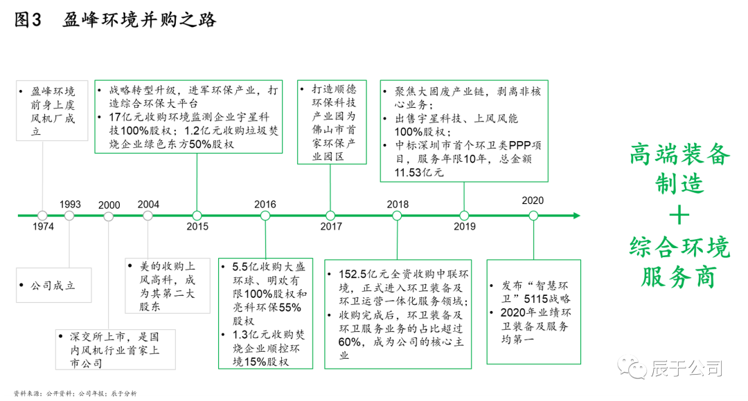 為加速轉(zhuǎn)型,作為“門(mén)外漢”的盈峰環(huán)境通過(guò)并購(gòu)切入環(huán)保市場(chǎng),先后收購(gòu)宇星科技、綠色東方、大盛環(huán)球、亮科環(huán)保、順控環(huán)境等,致力于打造成為“高端裝備制造+綜合環(huán)境服務(wù)商”(見(jiàn)圖3)。