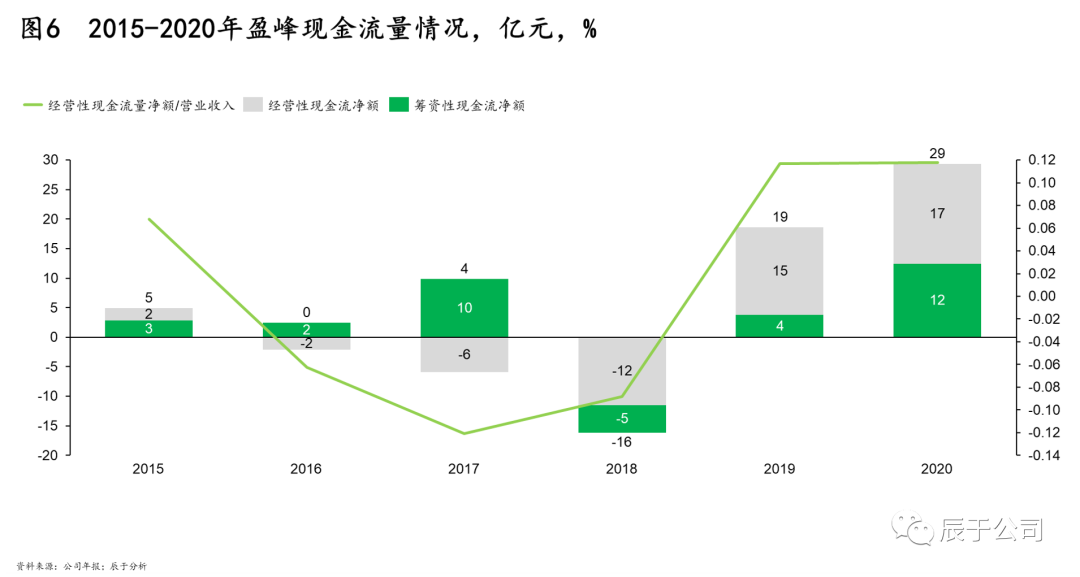 快速調(diào)整的“有進(jìn)有退”策略不僅讓盈峰環(huán)境的主業(yè)更加突出,也改善了盈峰環(huán)境的經(jīng)營(yíng)性現(xiàn)金流狀況,近兩年經(jīng)營(yíng)性現(xiàn)金流及其與營(yíng)收的比值扭虧為盈,增長(zhǎng)顯著(見(jiàn)圖5、圖6)。