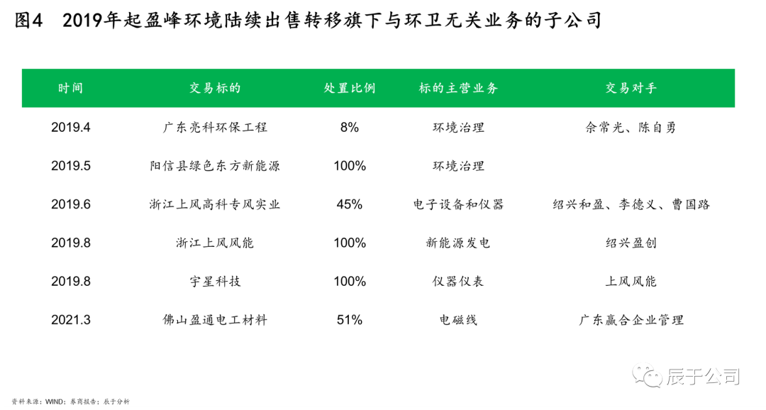 另一方面果斷剝離非環(huán)衛(wèi)相關(guān)業(yè)務(wù)。2019年起,盈峰環(huán)境陸續(xù)出售轉(zhuǎn)移旗下與環(huán)衛(wèi)無(wú)關(guān)業(yè)務(wù)的子公司,剝離的主要對(duì)象為低利潤(rùn)或者邊緣業(yè)務(wù),如電磁線業(yè)務(wù)利潤(rùn)率低,風(fēng)機(jī)與環(huán)境治理業(yè)務(wù)市場(chǎng)占有率低,行業(yè)地位低,都不利于公司主業(yè)競(jìng)爭(zhēng)力的提升;剝離的主要方式為剝離公司而非業(yè)務(wù),以環(huán)境監(jiān)測(cè)業(yè)務(wù)為例,雖然宇星科技被剝離,但是雙方明確五年內(nèi),乙方、標(biāo)的公司及宇星科技不得從事環(huán)境監(jiān)測(cè)業(yè)務(wù),宇星科技相關(guān)無(wú)形資產(chǎn)授權(quán)盈峰使用,不影響公司相關(guān)業(yè)務(wù)繼續(xù)拓展(見(jiàn)圖4)。