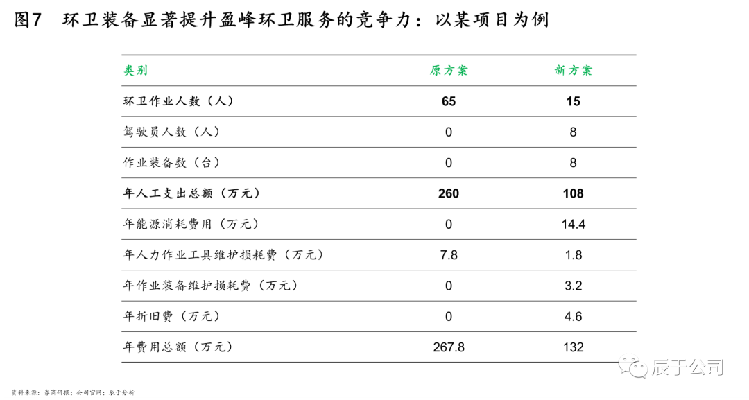 一方面,通過(guò)自有環(huán)衛(wèi)裝備優(yōu)勢(shì)強(qiáng)化環(huán)衛(wèi)服務(wù)拿單能力。以某項(xiàng)目為例,傳統(tǒng)環(huán)衛(wèi)項(xiàng)目方案年費(fèi)用總額為267.8萬(wàn)元,相比之下,盈峰涉及的機(jī)械化新方案僅為132萬(wàn)元,年度總費(fèi)用投入消減50.7%,作業(yè)人員隊(duì)伍精簡(jiǎn)64.6%(見(jiàn)圖7)。