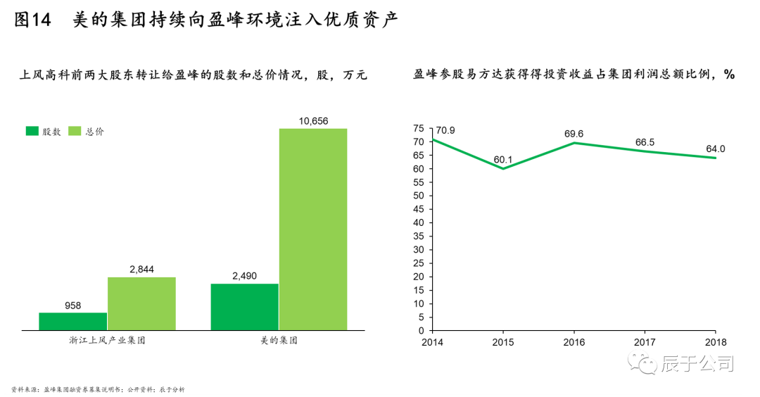 三是資本運(yùn)作方面。美的集團(tuán)持續(xù)多年向盈峰環(huán)境注入旗下優(yōu)質(zhì)資產(chǎn),為盈峰早期的規(guī)模擴(kuò)張?zhí)峁┝舜罅χС?。?006年2月,上風(fēng)高科前兩大股東浙江上風(fēng)產(chǎn)業(yè)集團(tuán)及美的集團(tuán)將其各自持有公司的法人股轉(zhuǎn)讓給盈峰集團(tuán),從每股價(jià)格來(lái)看,在入主兩年多后,美的集團(tuán)僅僅按原價(jià)轉(zhuǎn)讓,并沒(méi)取得投資收益,可謂原價(jià)轉(zhuǎn)手;而對(duì)于盈峰而言,這是其體系內(nèi)的首家上市公司,為公司未來(lái)發(fā)展發(fā)揮了至關(guān)重要的作用。又如2007年4月,美的以1.65億元的價(jià)格向盈峰集團(tuán)轉(zhuǎn)讓易方達(dá)基金25%股權(quán),易方達(dá)成為盈峰金融板塊的主要成員,自此,盈峰從易方達(dá)獲得的投資收益多年來(lái)占到公司利潤(rùn)總額的60%以上(見(jiàn)圖14)。