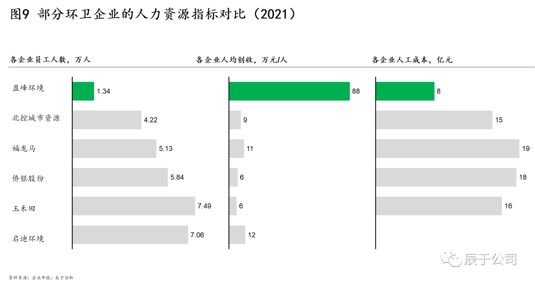 此外,這一模式也讓盈峰環(huán)境跳出了“環(huán)衛(wèi)企業(yè)=人多、人均創(chuàng)收低、技術(shù)含量低”的傳統(tǒng)環(huán)衛(wèi)企業(yè)形象。眾所周知,傳統(tǒng)環(huán)衛(wèi)屬勞動(dòng)密集產(chǎn)業(yè),企業(yè)多以人員投入多、人均創(chuàng)收低、技術(shù)投入低等模式運(yùn)營(yíng),機(jī)械化程度不足。而盈峰憑借裝備領(lǐng)域積累的技術(shù)優(yōu)勢(shì),在包括兩大深圳項(xiàng)目在內(nèi)的眾多項(xiàng)目運(yùn)營(yíng)中,應(yīng)用了自主研發(fā)的全球首批智能小型環(huán)衛(wèi)機(jī)器人編隊(duì),大大提升項(xiàng)目機(jī)械化率,也使項(xiàng)目的人均產(chǎn)值顯著攀升(見(jiàn)圖9)。