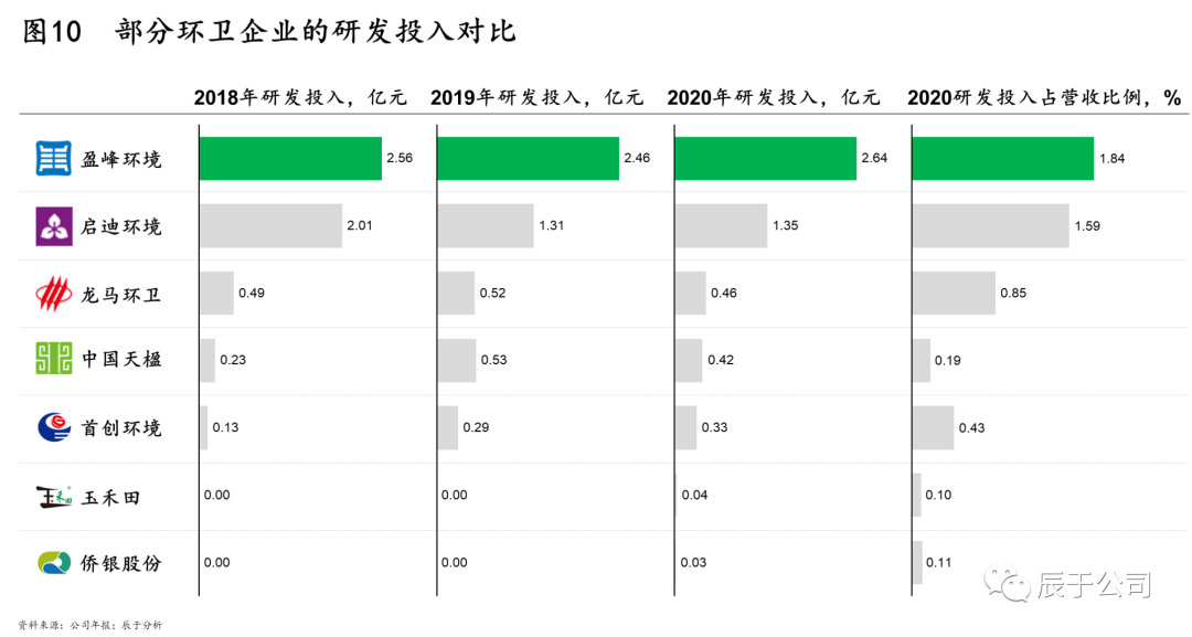 相比其他競(jìng)爭(zhēng)對(duì)手,盈峰環(huán)境在研發(fā)上的投入明顯更大,2018-2020年的研發(fā)投入絕對(duì)值一直遙遙領(lǐng)先其他企業(yè),研發(fā)投入占營(yíng)收比例也明顯更高(見(jiàn)圖10)。