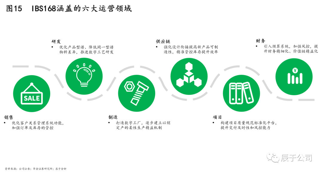 四是管理賦能方面。美的不斷將自身在家電領(lǐng)域的豐富經(jīng)驗(yàn)賦能給盈峰環(huán)境,例如,盈峰環(huán)境2019年提出IBS168計(jì)劃,正是以美的水準(zhǔn)打造的數(shù)字化管理系統(tǒng)。該系統(tǒng)的IBS指Infore Business System,構(gòu)建了以市場(chǎng)、客戶為導(dǎo)向的新型訂單預(yù)定模式,建立了內(nèi)外協(xié)同價(jià)值鏈的運(yùn)營(yíng)體系,覆蓋研發(fā)、營(yíng)銷(xiāo)、供應(yīng)鏈、財(cái)務(wù)、項(xiàng)目、服務(wù)6大運(yùn)營(yíng)領(lǐng)域(見(jiàn)圖15),包含產(chǎn)品生命周期、客戶關(guān)系、供應(yīng)商關(guān)系、制造執(zhí)行、企業(yè)資源、設(shè)備管理、組織管理、彈性制造8大管理體系。系統(tǒng)的目的是推動(dòng)全業(yè)務(wù)的數(shù)字化轉(zhuǎn)型,通過(guò)建立數(shù)字化精益制造管理體系,達(dá)到產(chǎn)銷(xiāo)、產(chǎn)研的高效對(duì)接并實(shí)現(xiàn)降本增效,應(yīng)用于盈峰的環(huán)衛(wèi)裝備、環(huán)衛(wèi)服務(wù)和其他固廢等業(yè)務(wù)。