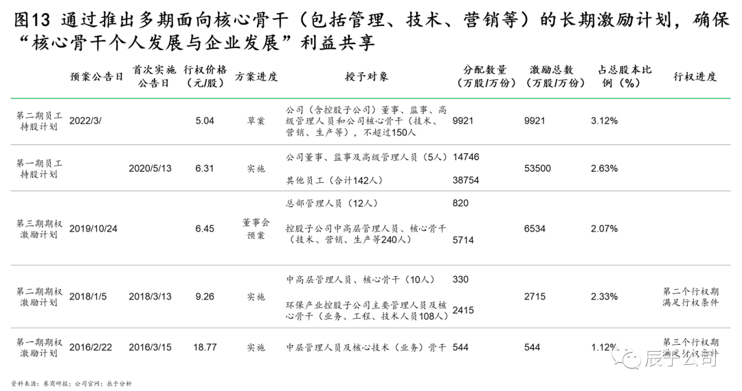 二是政策機(jī)制支持方面。盈峰環(huán)境引入美的經(jīng)驗(yàn),通過(guò)推出多期面向核心骨干(包括管理、技術(shù)、營(yíng)銷(xiāo)等)的長(zhǎng)期激勵(lì)計(jì)劃,確?!昂诵墓歉蓚€(gè)人發(fā)展與企業(yè)發(fā)展”利益共享(見(jiàn)圖13)。