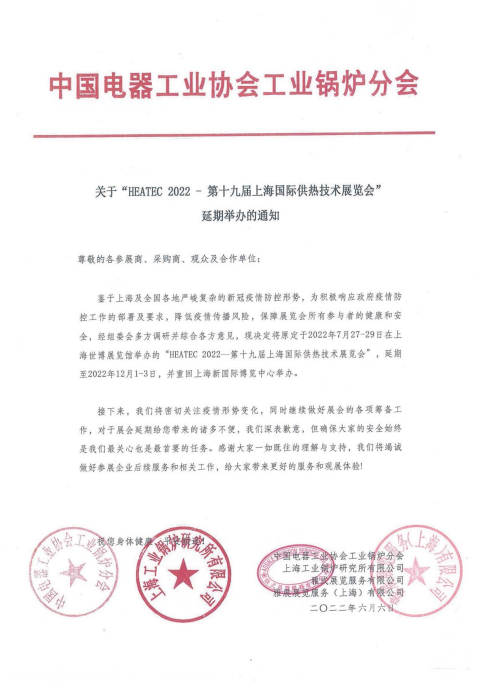 關(guān)于“HEATEC 2022—第十九屆上海國際供熱技術(shù)展覽會(huì)”延期舉辦的通知
