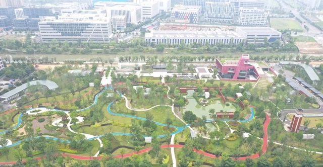 成都市雙流公興(中電子)再生水廠項(xiàng)目設(shè)計(jì)規(guī)模10萬(wàn)噸/日,采用地下式設(shè)計(jì),大大節(jié)約占地面積,地上是開(kāi)放式生態(tài)綠地公園及科普教育中心,有效滿足城市界面與基礎(chǔ)設(shè)施環(huán)境高度融合,還社會(huì)以廣闊的自然空間。同時(shí),項(xiàng)目以新理念、高標(biāo)準(zhǔn)打造,在環(huán)境融合度、建設(shè)標(biāo)準(zhǔn)和功能延伸方面突破傳統(tǒng),賦予了城市基礎(chǔ)設(shè)施更大價(jià)值。