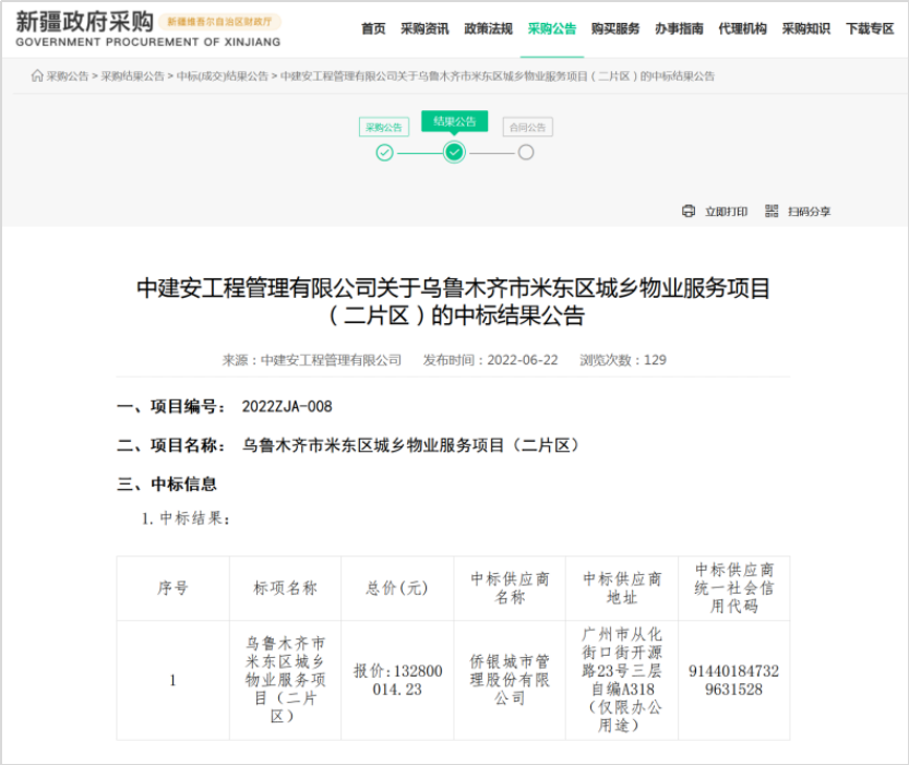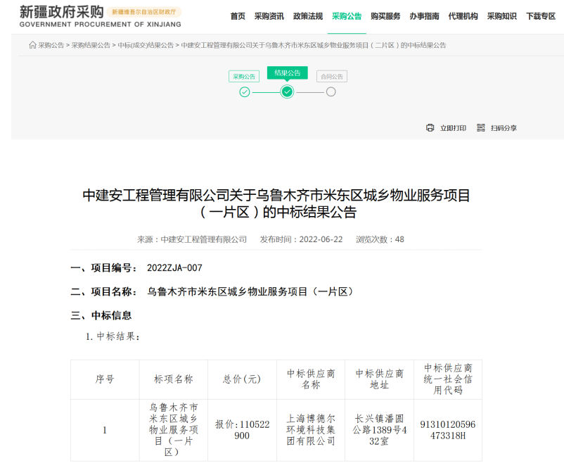新疆政府采購網(wǎng)消息,2022年6月22日,烏魯木齊市米東區(qū)城鄉(xiāng)物業(yè)服務(wù)項目公布開標(biāo)結(jié)果,兩個片區(qū)中標(biāo)合同金額超過24億元,成交情況如下: