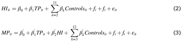 關(guān)鍵解釋變量為TP,即當(dāng)年ETS是否實(shí)施(T)與企業(yè)是否屬于碳市場試點(diǎn)地區(qū)(P)兩個(gè)虛擬變量的交乘項(xiàng),系數(shù)α1反映政策實(shí)施后,試點(diǎn)地區(qū)與非試點(diǎn)地區(qū)高碳企業(yè)市場支配力變化的差異??刂菩袠I(yè)固定效應(yīng)與時(shí)間固定效應(yīng)。