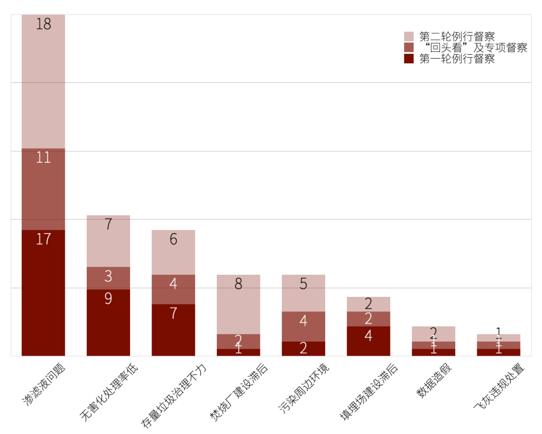 在2015-2022年的中央環(huán)保督察反饋中,個別問題在兩輪例行督察和“回頭看”及專項督察中反復(fù)出現(xiàn),包括滲濾液違規(guī)處理、無害化處理率低、存量垃圾治理不力、焚燒廠建設(shè)滯后、污染周邊環(huán)境、填埋場建設(shè)滯后、填埋場數(shù)據(jù)造假、飛灰違規(guī)處置,反復(fù)出現(xiàn)的問題共119次,占問題總頻次161次的比例高達74%。