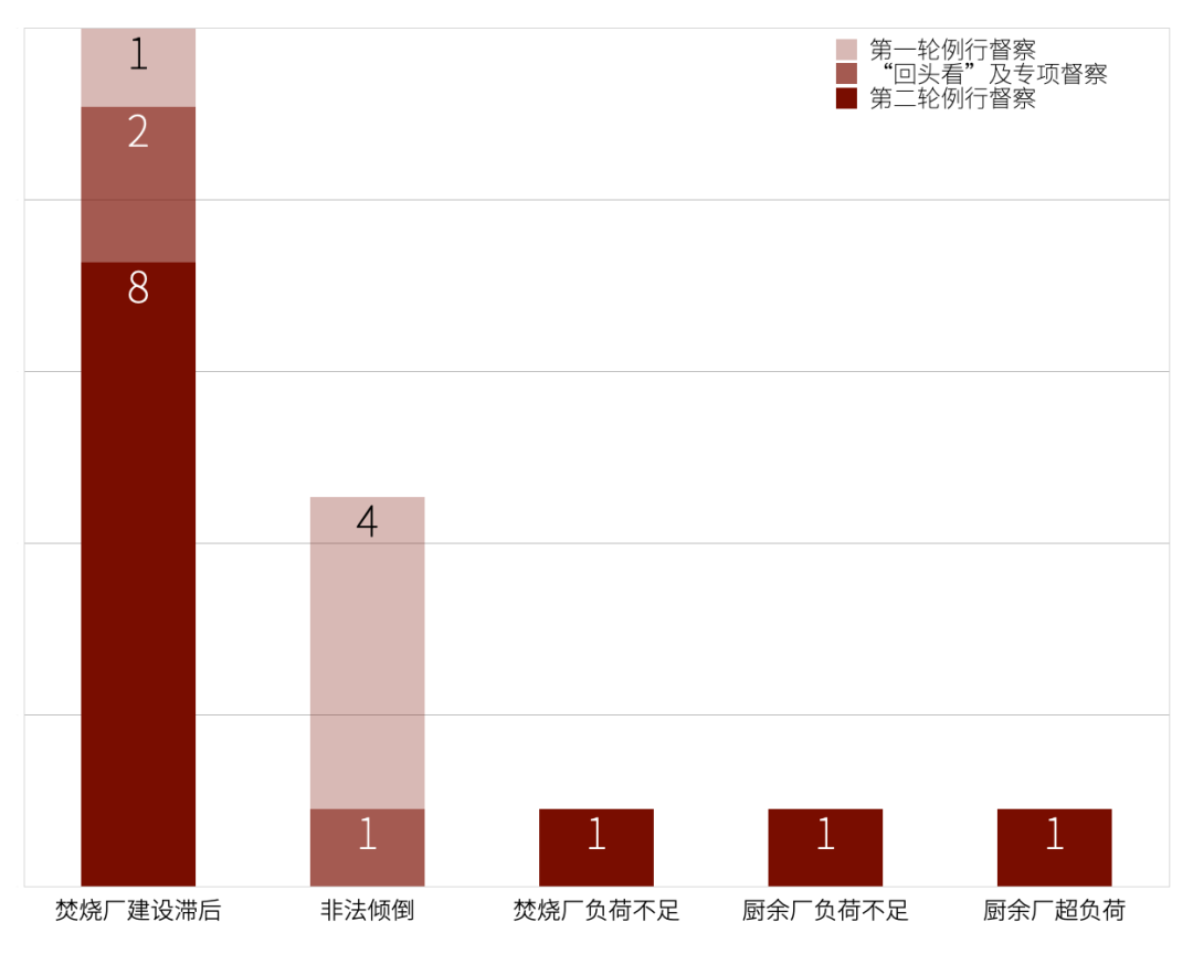 一些生活垃圾問題隨著我國垃圾管理的發(fā)展逐漸減少。其中,生活垃圾非法傾倒問題在第一次例行督察中4個省區(qū)市被反饋該問題,在“回頭看”及專項督察時降至2個,在第二次例行督察中降至0個;