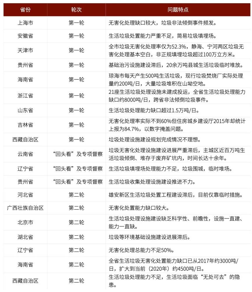 個別省區(qū)市歷史上無害化處理率低、無害化處理能力不足問題嚴(yán)重。其中,山東省在第一輪例行督察中被中央環(huán)保督察組反饋“生活垃圾處理能力缺口超過1.5萬噸/日”、云南省在“回頭看”及專項督察中被反饋“垃圾無害化處理設(shè)施建設(shè)進展嚴(yán)重滯后,主城區(qū)近百萬噸生活垃圾傾倒、堆存于廢棄礦坑內(nèi),時間長達十余年”、北京市第二輪例行督察被反饋“生活垃圾處理設(shè)施建設(shè)缺乏科學(xué)性、前瞻性,設(shè)施一直建、能力一直缺”等。具體情況詳見表1。