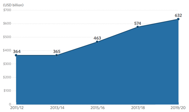 2019/2020年,來自政府的氣候投融資資金流量(國內(nèi)和國際)增長了17%,占公共部門資金流量(380億美元)的12%,主要由低碳交通驅(qū)動(dòng),并通過贈(zèng)款的方式提供資金。
