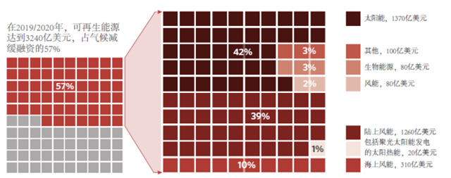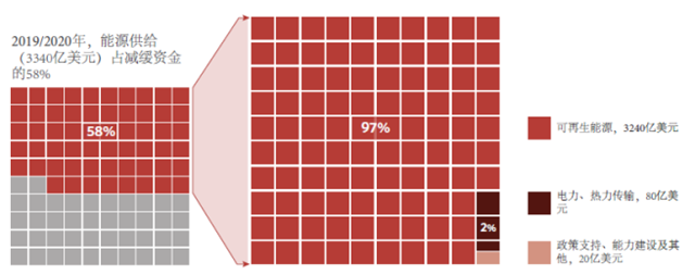 2019-2020年,90%可溯源的氣候投融資用于減緩氣候變化,平均每年達(dá)到5710億美元,比2017-2018年增加了340億美元左右。如下圖所示,減緩資金中,對(duì)于能源供給的投資是主要組成部分(3340億美元,58%),同時(shí)也占全部氣候融資資金的53%。盡管新冠肺炎疫情對(duì)全球經(jīng)濟(jì)產(chǎn)生了影響,但年平均與2017/2018年相比,2019/2020年的可再生能源投資保持穩(wěn)定,在全部能源融資資金中占比97%。值得注意的是,由于太陽能和風(fēng)能技術(shù)的成本大幅降低,同樣的投資水平可以轉(zhuǎn)化為比2017/2018年更大的新增產(chǎn)能。