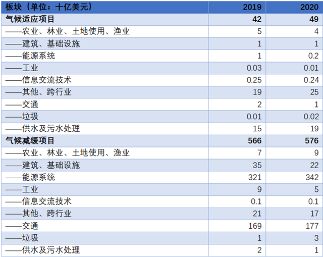 表1 2019-2020年全球氣候適應(yīng)、減緩項(xiàng)目投融資規(guī)模(按用途劃分)
