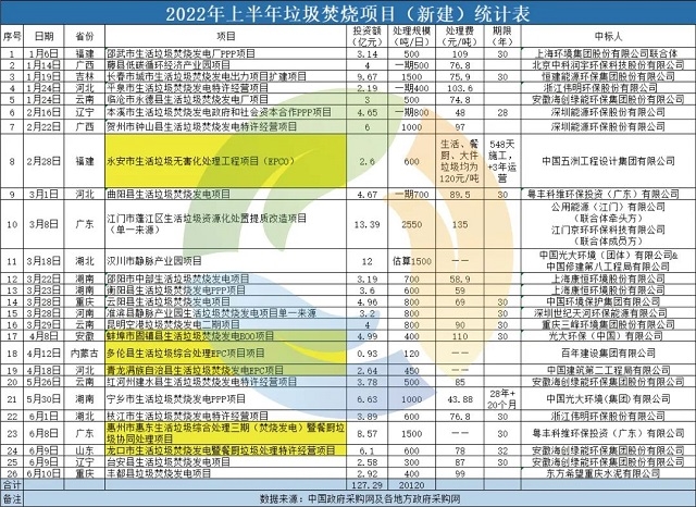 ▼2022年上半年垃圾焚燒項目(新建)統(tǒng)計表(注:標黃為焚燒+協同處置項目,共計6個)