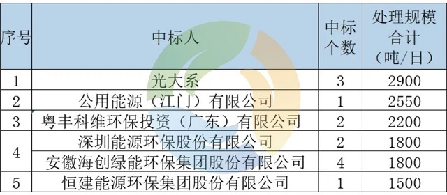 從中標企業(yè)上看,26個項目共計17個企業(yè)/集團中標。按處理規(guī)模統(tǒng)計,前五名企業(yè)排名如下(注:深能環(huán)保和海創(chuàng)綠能并列第四):