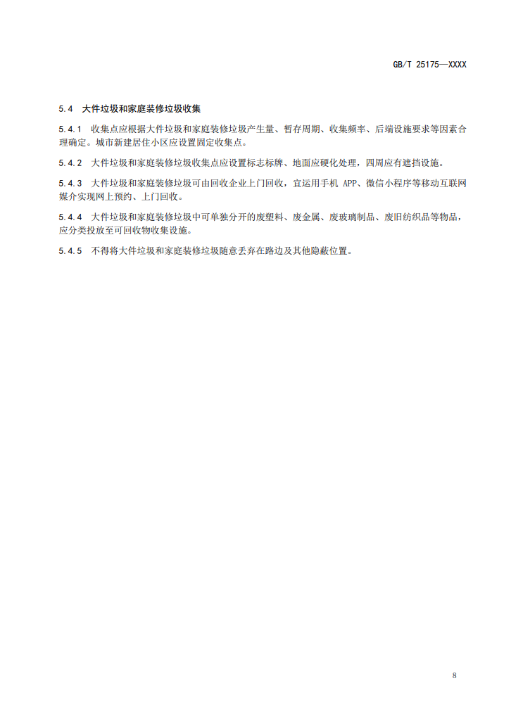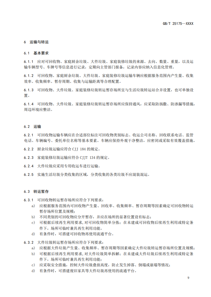 8、可回收物、家庭廚余垃圾、大件垃圾、家庭裝修垃圾的收集、轉(zhuǎn)運(yùn)暫存、運(yùn)輸方式應(yīng)與后續(xù)的分揀、拆解、利用等方式相適應(yīng)。