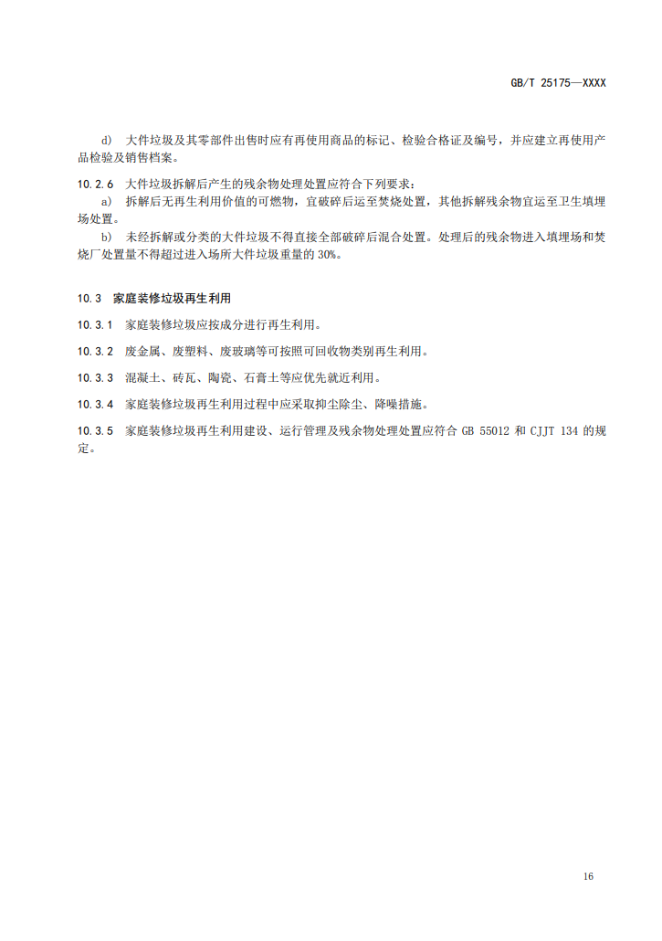 5、家庭裝修垃圾再生利用建設(shè)、運(yùn)行管理及殘余物處理處置應(yīng)符合GB55012和CJJT134的規(guī)定。