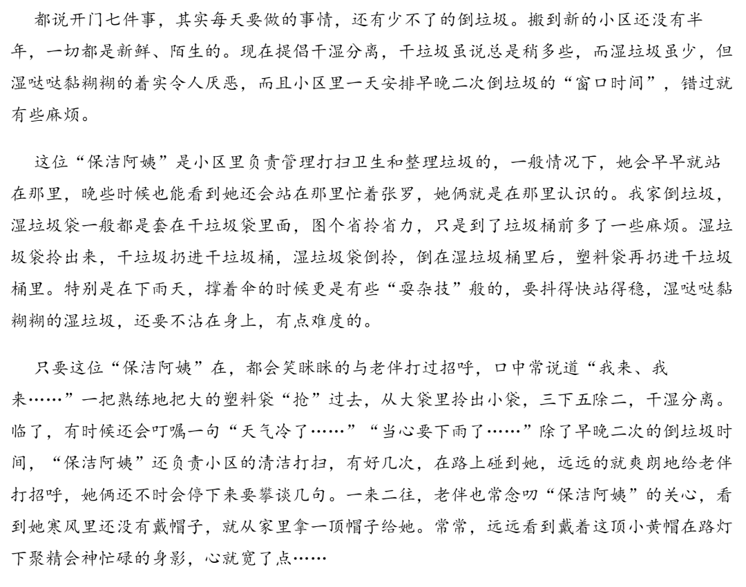 第三個(gè)付出,就是每天早晨七點(diǎn)到九點(diǎn),晚上六點(diǎn)到八點(diǎn)要去定時(shí)去丟垃圾,這個(gè)時(shí)間雷打不動(dòng)、刮風(fēng)下雨、過(guò)年過(guò)節(jié)、再忙再累,也都要去。很多時(shí)候都已經(jīng)到07:50了,才夫妻兩個(gè)人急急忙忙拎著4袋垃圾出門(mén)去丟,然后呢,還看到很多人和我們一起拎著垃圾袋沖向垃圾箱。這也是很重要的一個(gè)時(shí)間付出吧。