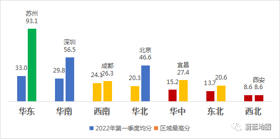 華東區(qū)、華南區(qū)因新加入的蕪湖、馬鞍山、東營(yíng)、佛山得分較低,平均分略有下降,西南、華北、華中、東北和西北平均分均有所增長(zhǎng)。