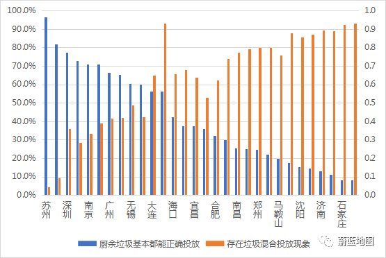 蘇州廚余垃圾正確投放率超過(guò)90.0%,武漢、石家莊隨手拍結(jié)果中顯示存在多種垃圾混合投放的比例超過(guò)90%。