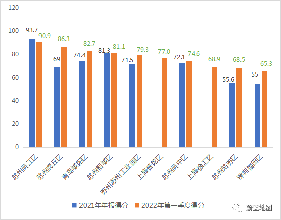 得分前十的城市主城區(qū)中,蘇州參評(píng)的六個(gè)城區(qū)依舊盡數(shù)在榜,位次略有變化,吳江區(qū)以90.9分保持第一,虎丘區(qū)、姑蘇區(qū)得分有明顯增長(zhǎng)。上海普陀區(qū)、徐匯區(qū)取代南京玄武區(qū)和深圳羅湖區(qū)進(jìn)入前十,位居第六和第八。