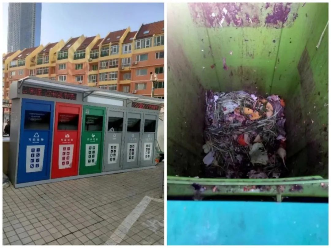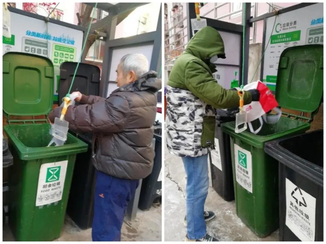 圖10 北京市石景山區(qū)久筑社區(qū)居民在破袋投放廚余垃圾,拍攝:光明之子_1097570,拍攝時(shí)間:2022年2月4日(左)、2022年2月15日(右)